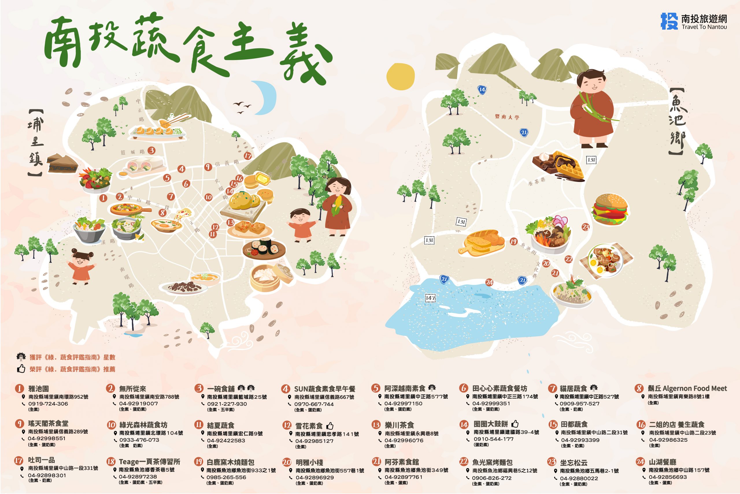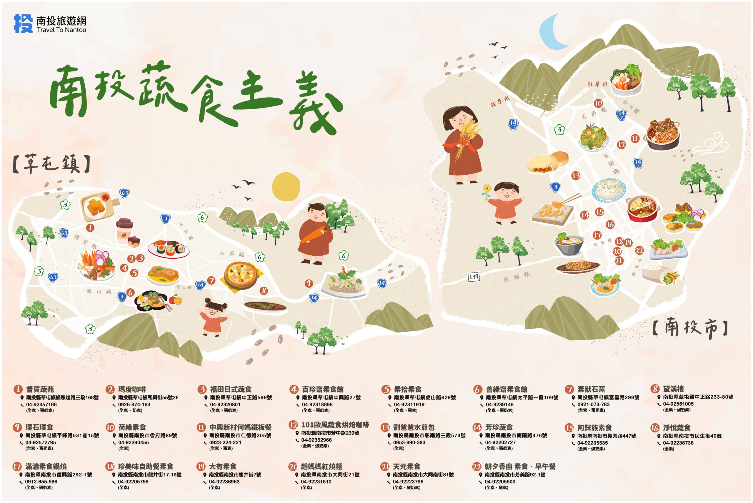 精心製作了南投四個鄉鎮市的蔬食地圖,分別推出「南投市與草屯鎮」以及「埔里鎮與魚池鄉」兩款蔬食店家地圖,集結在地優質蔬食餐廳與小吃,讓大家輕鬆找到美味又健康的好選擇。歡迎民眾下載使用,跟著地圖一起探索在地新鮮農作物的好滋味,支持蔬食生活,為環保盡一份心力,守護我們共同的美麗地球!
