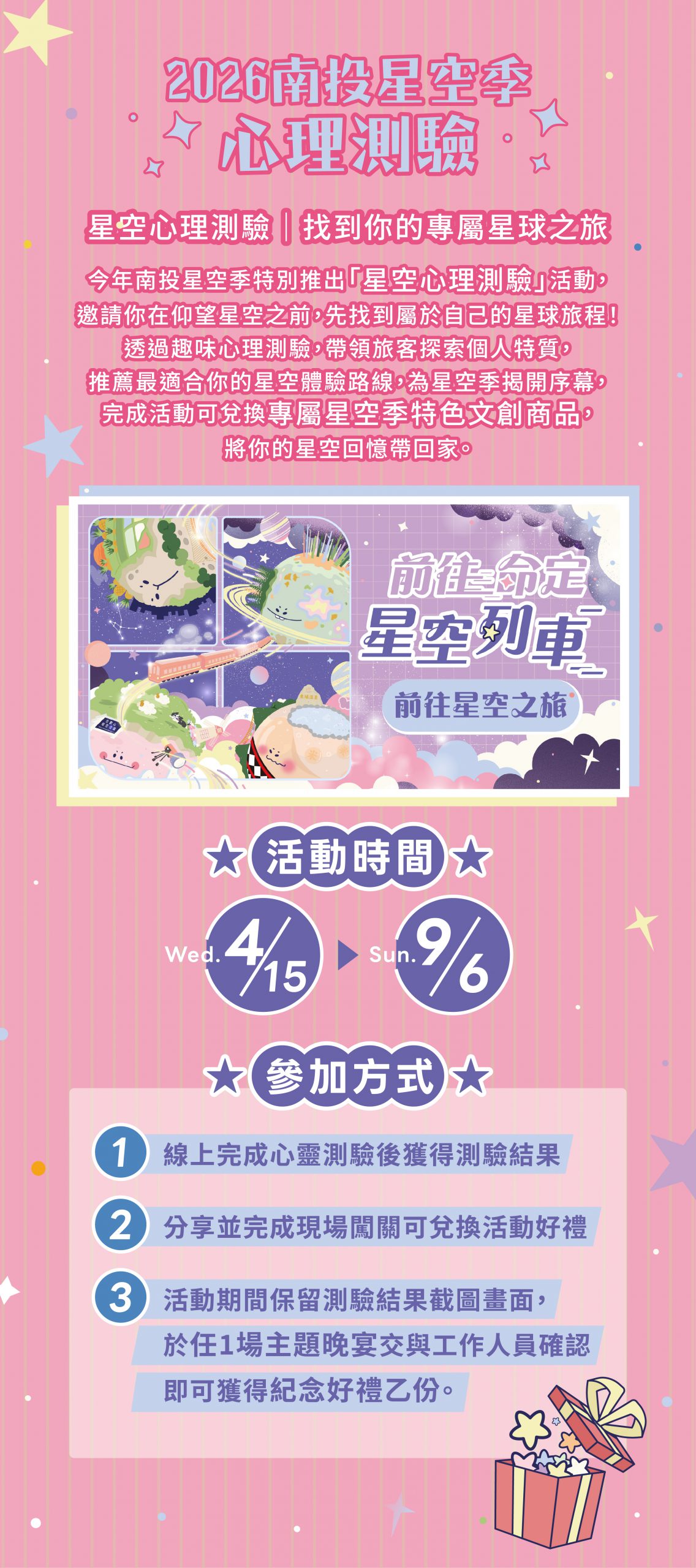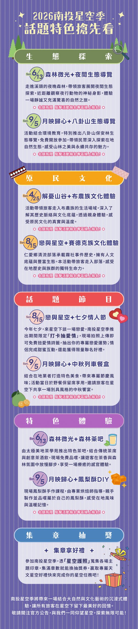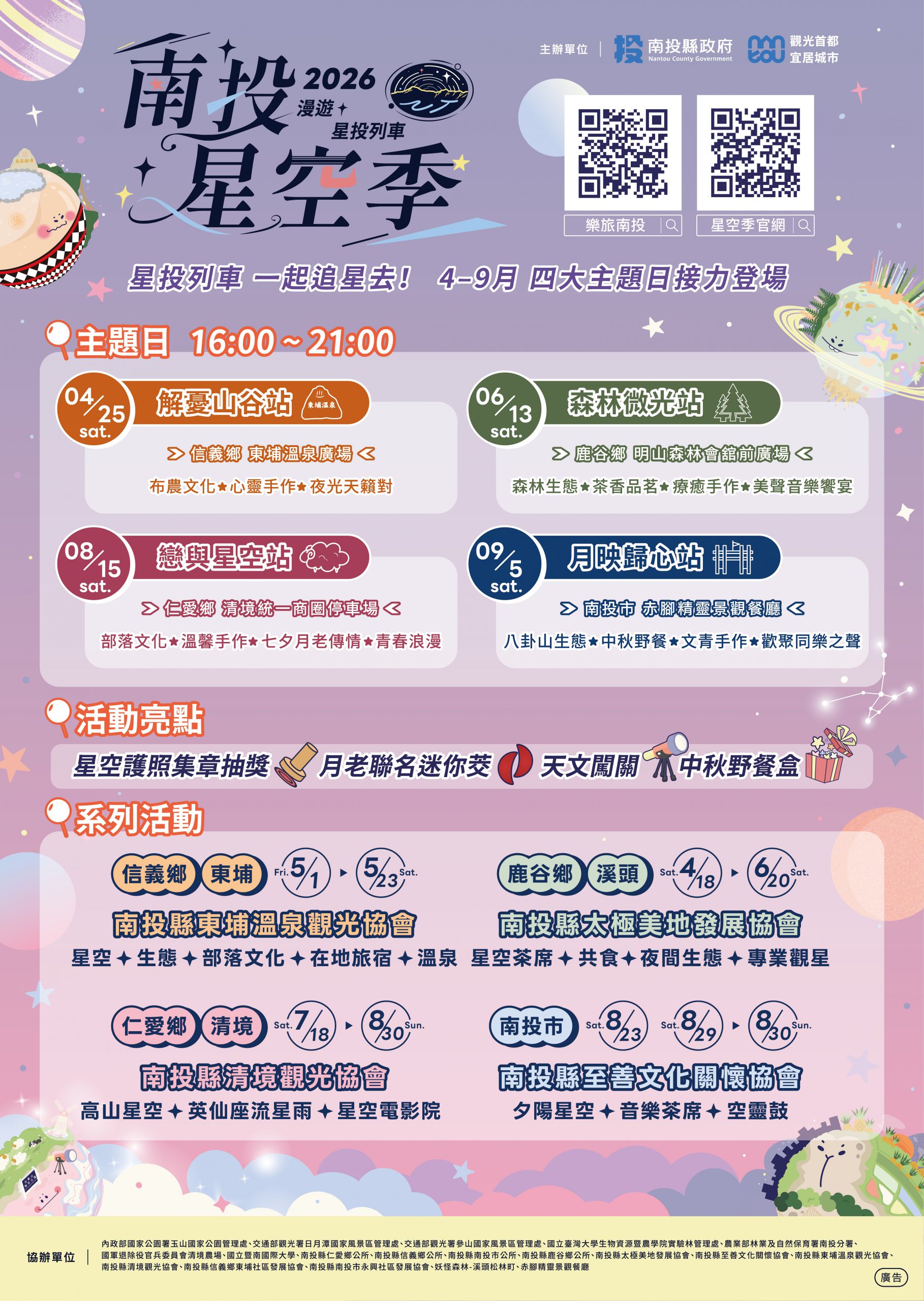 2026南投星空季即將登場!今年活動將結合清境、日月潭、杉林溪、東埔等地,舉辦星空音樂會、野餐晚會等多場精彩活動,歡迎一同共襄盛舉。